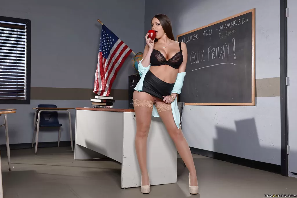 Пышная школьница Бруклин Чейз снимает кожаную юбку во время стриптиза