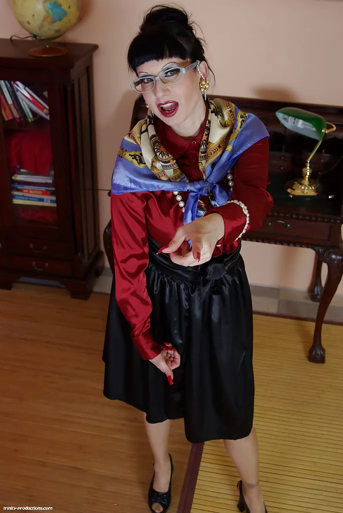 Похотливая зрелая учительница в очках обнажает свои сиськи и попку перед парнем