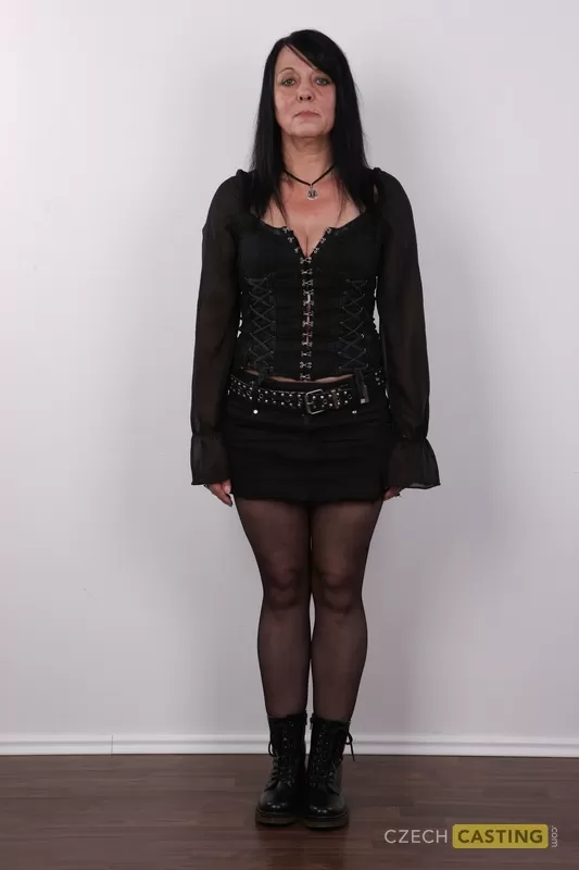 Пожилая брюнетка Ева снимает с себя одежду и ботинки, чтобы полностью раздеться