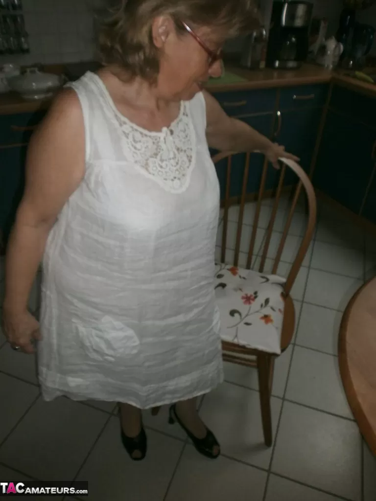 Пожилая дама с великолепными ногами показывает свои покрытые потными волосами подмышки