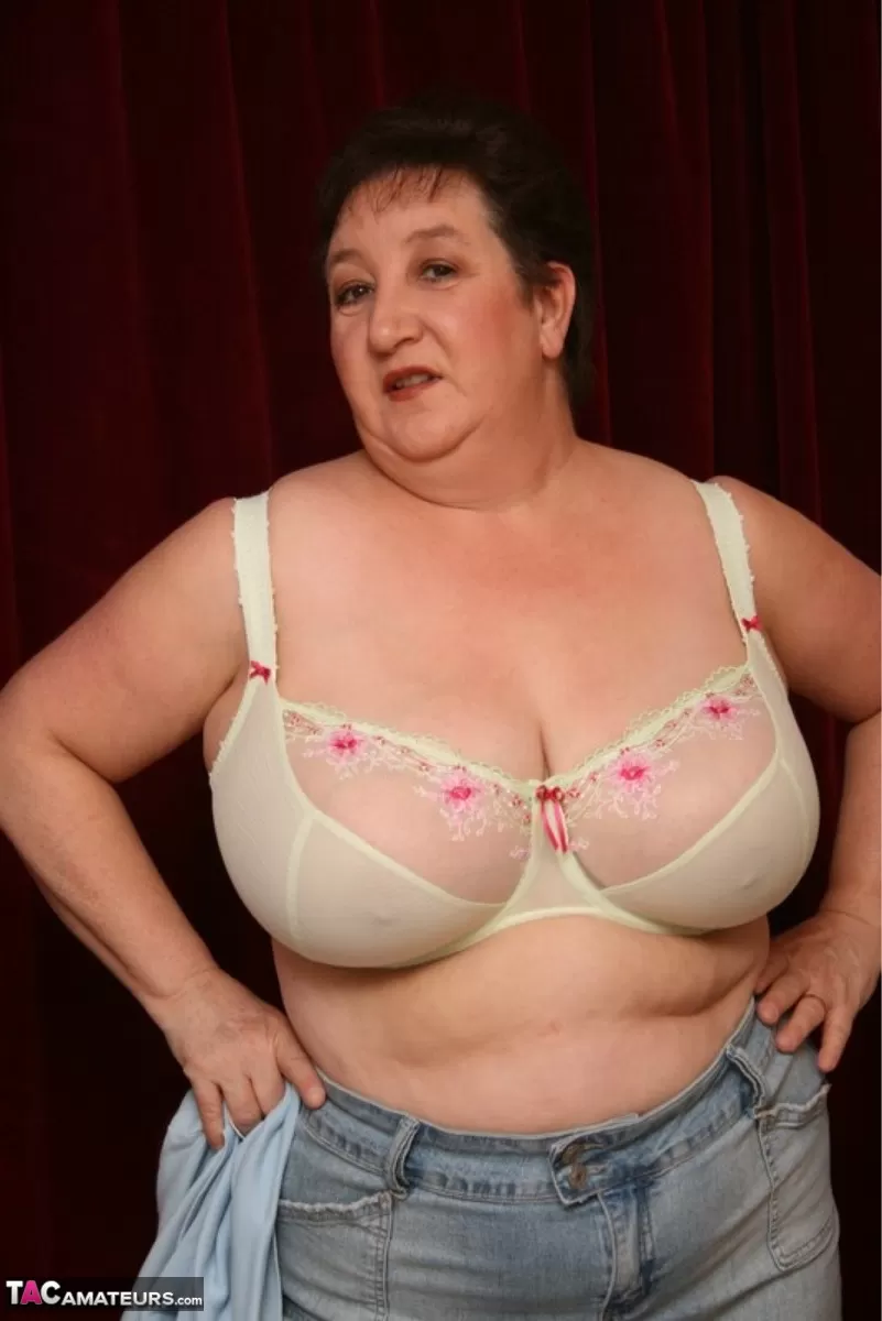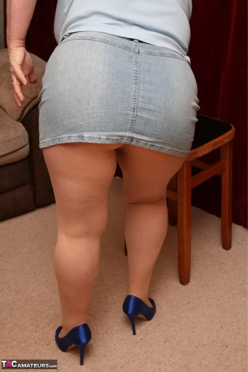 Пожилая жирная кудрявая Кэрол задирает джинсовую мини-юбку, чтобы показать свою большую задницу