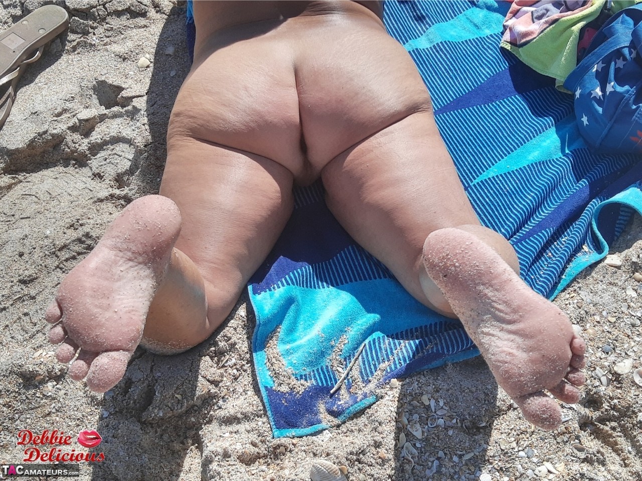 Пожилая любительница Дебби Делишес загорает в тени на нудистском пляже