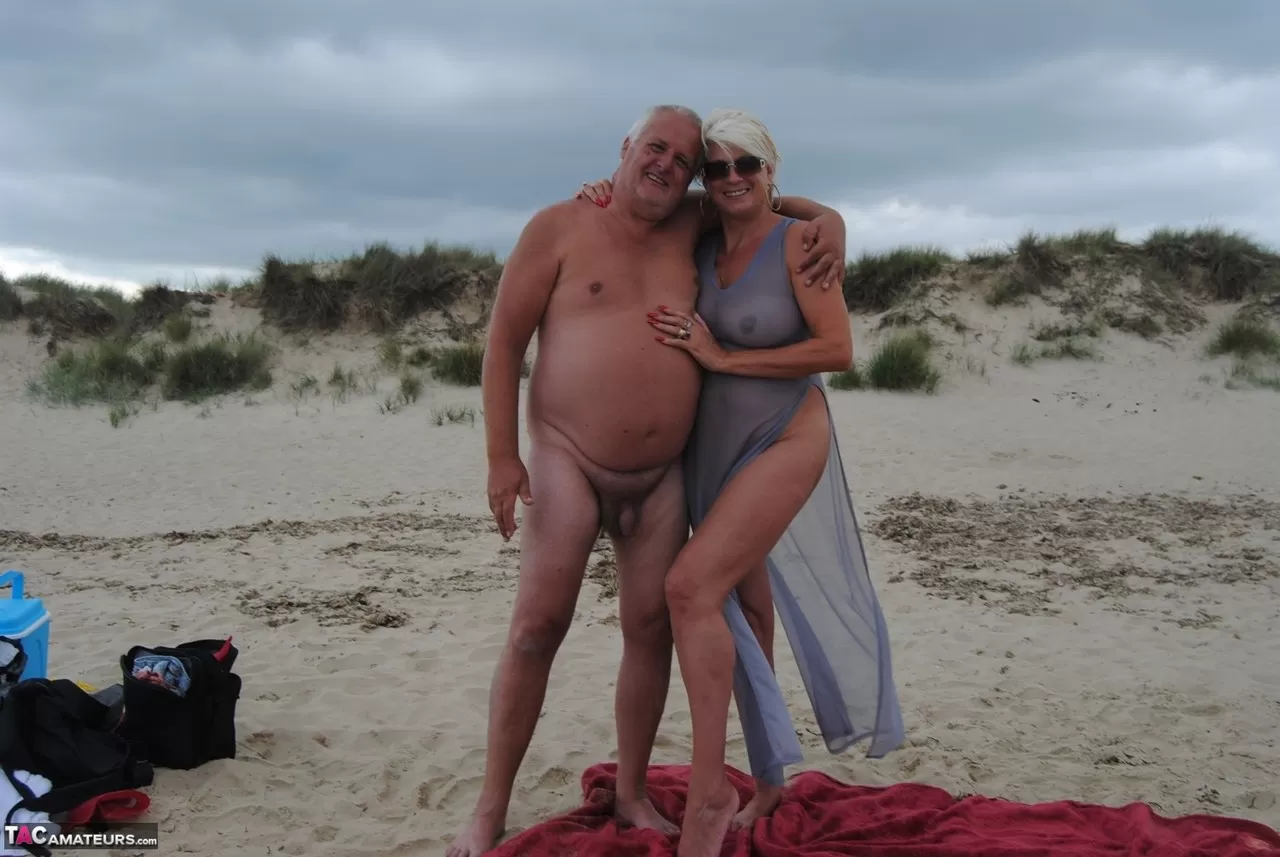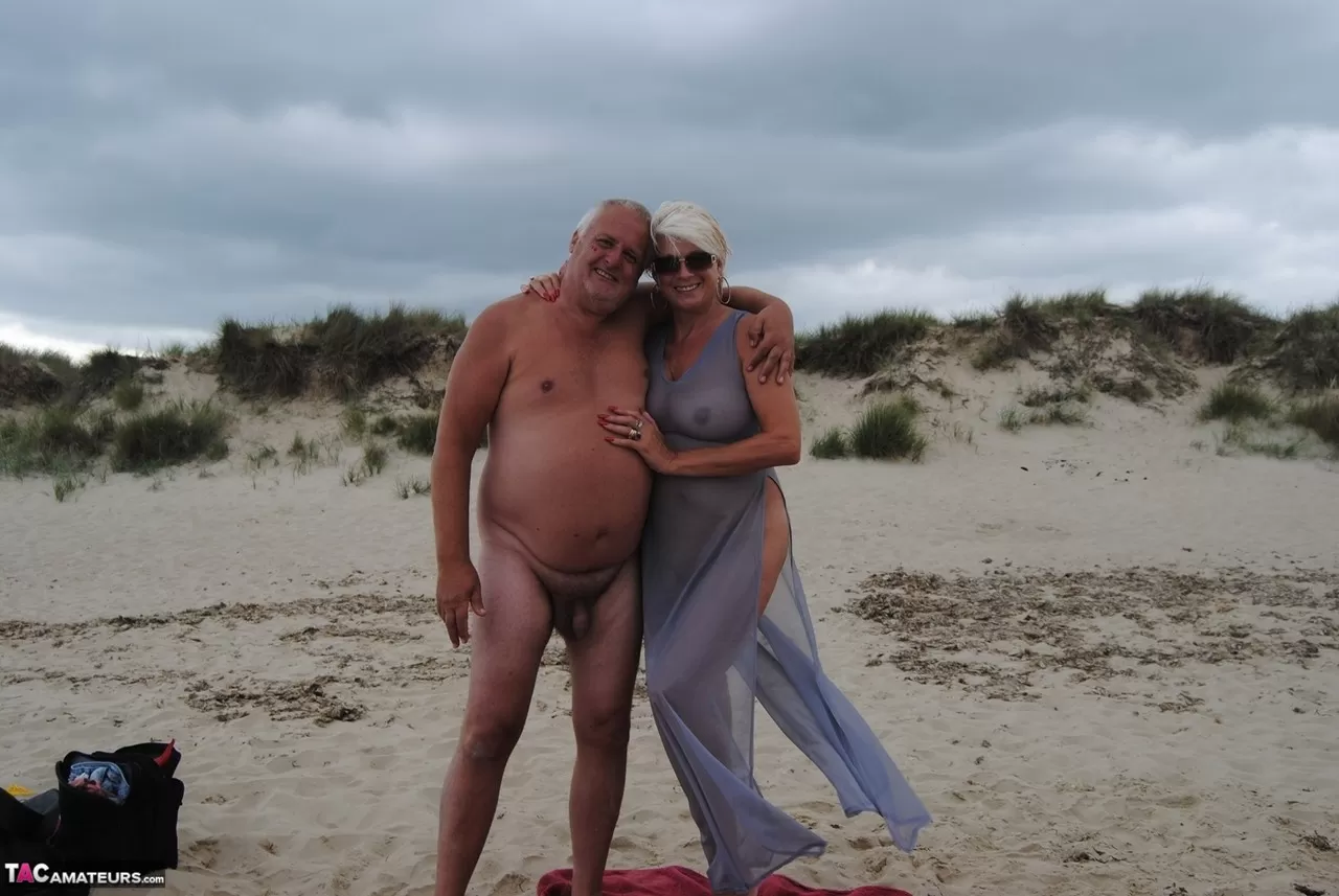 Пожилая платиновая блондинка Димонти посылает воздушный поцелуй на нудистском пляже со своим мужчиной