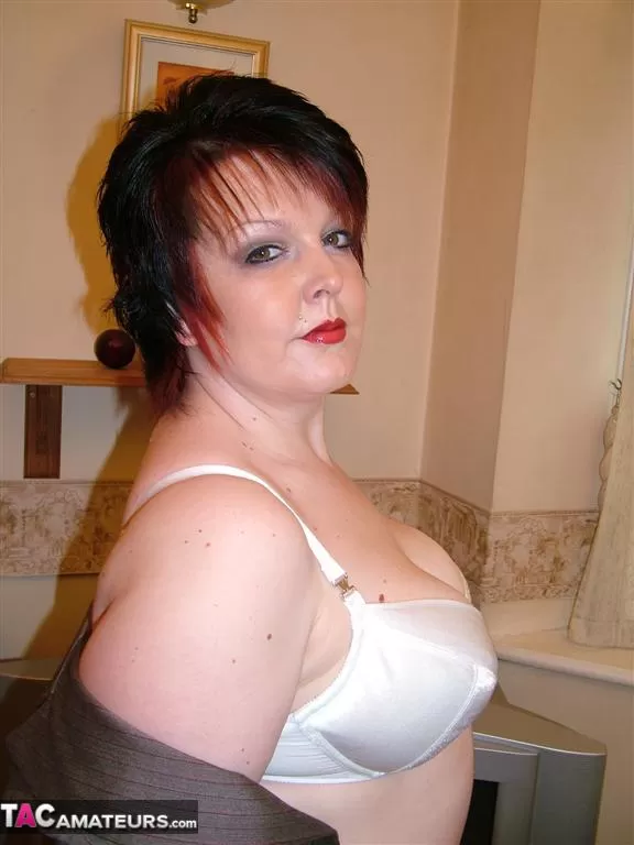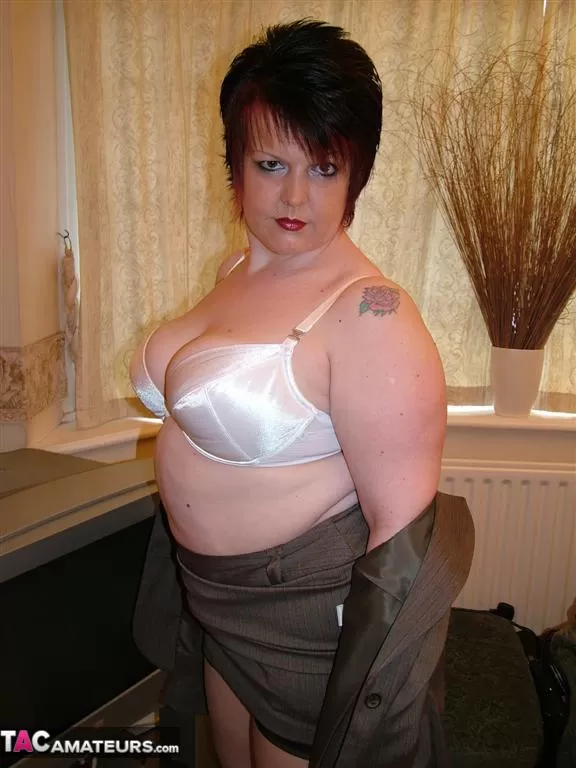 Полная британка Дабл Ди задирает юбку в нейлоновых чулках с задним швом