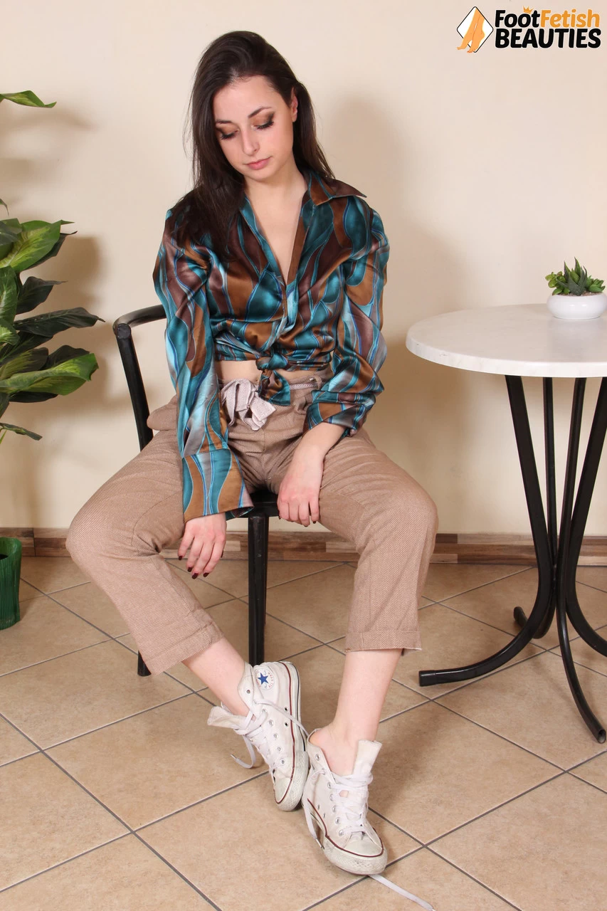 Полностью одетая брюнетка Илария освобождает свои красивые ножки от парусиновых кроссовок