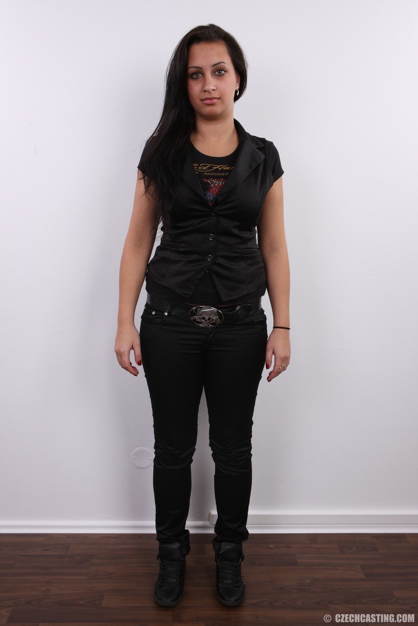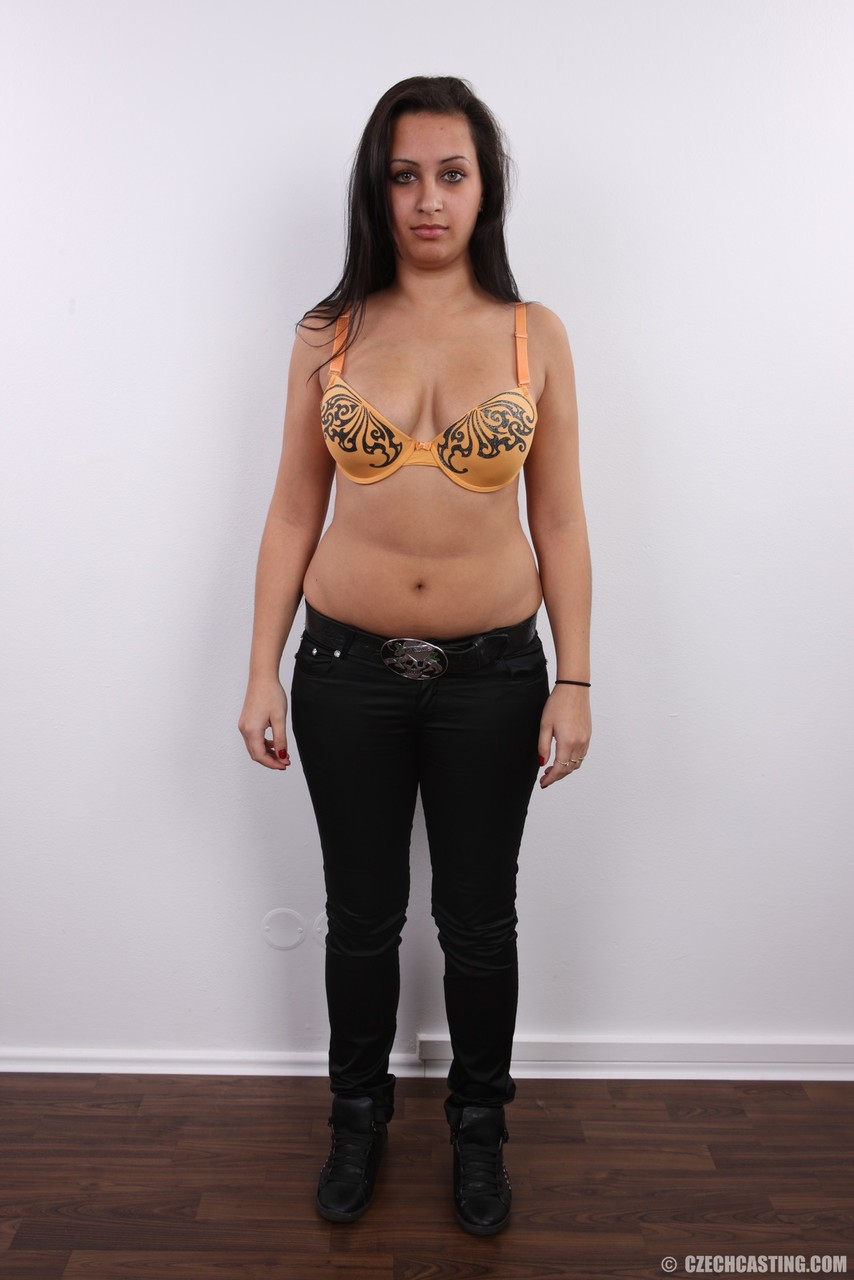 Пухленькая брюнетка Эрика садится на табурет после того, как полностью разделась