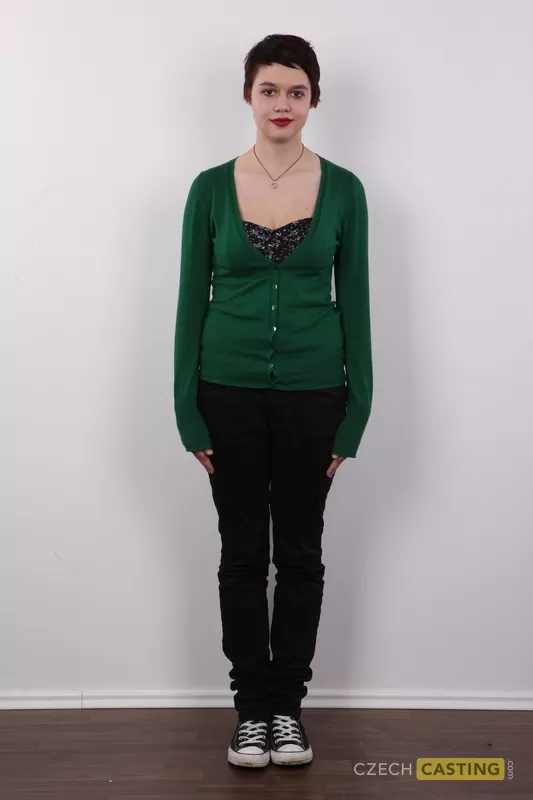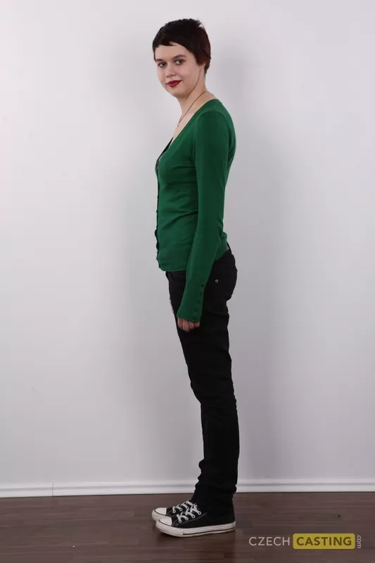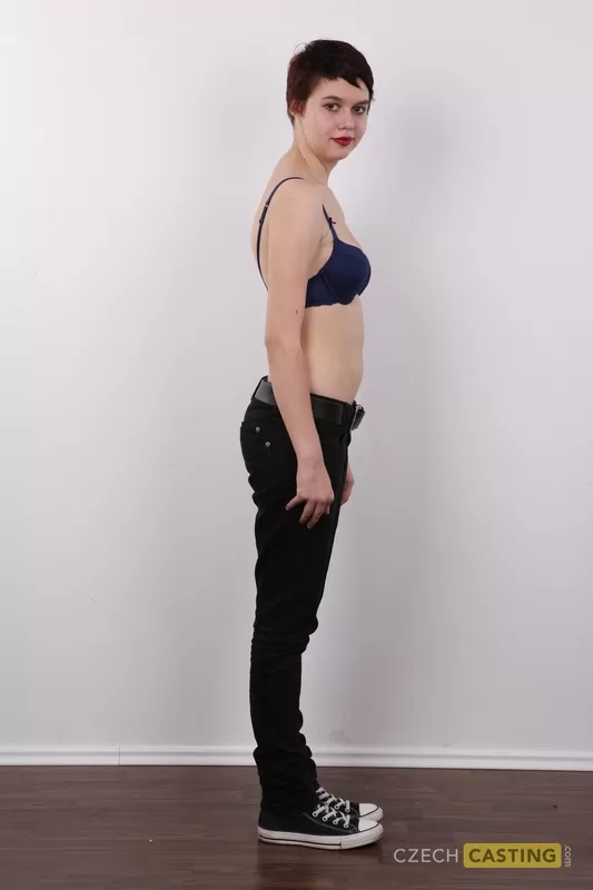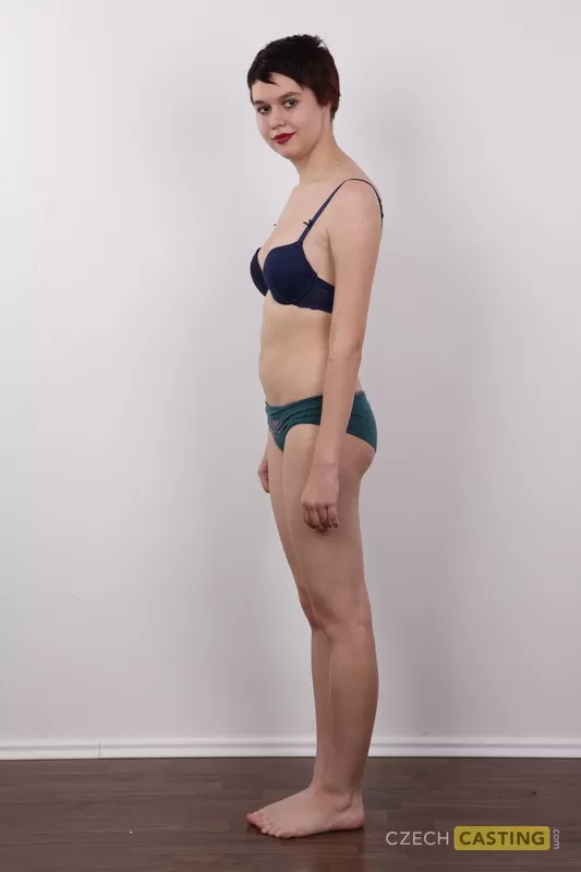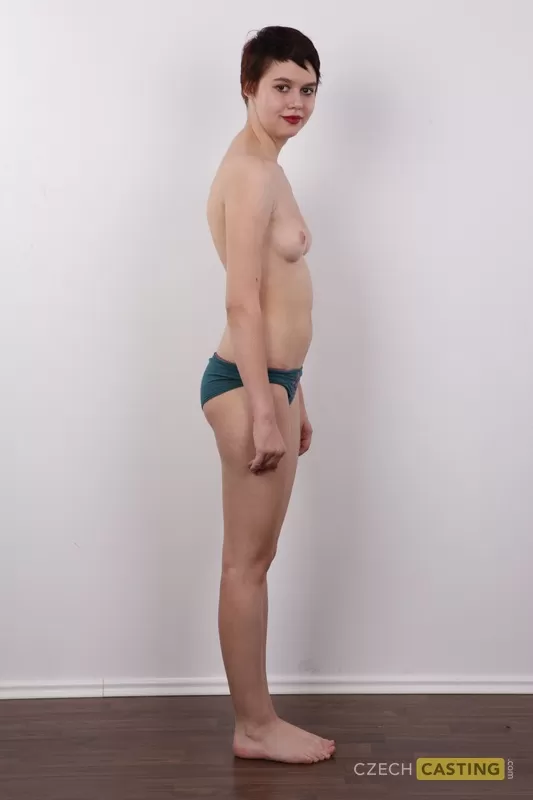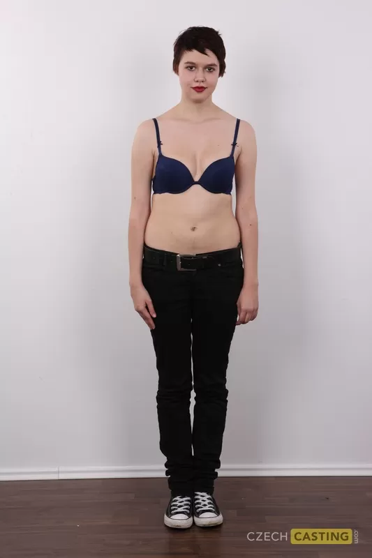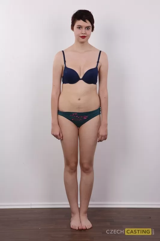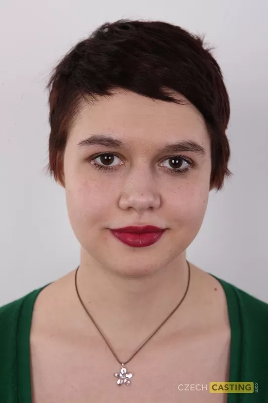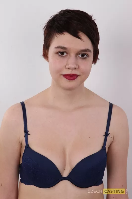 Пухленькая девушка с короткими волосами и красными губами впервые раздевается догола