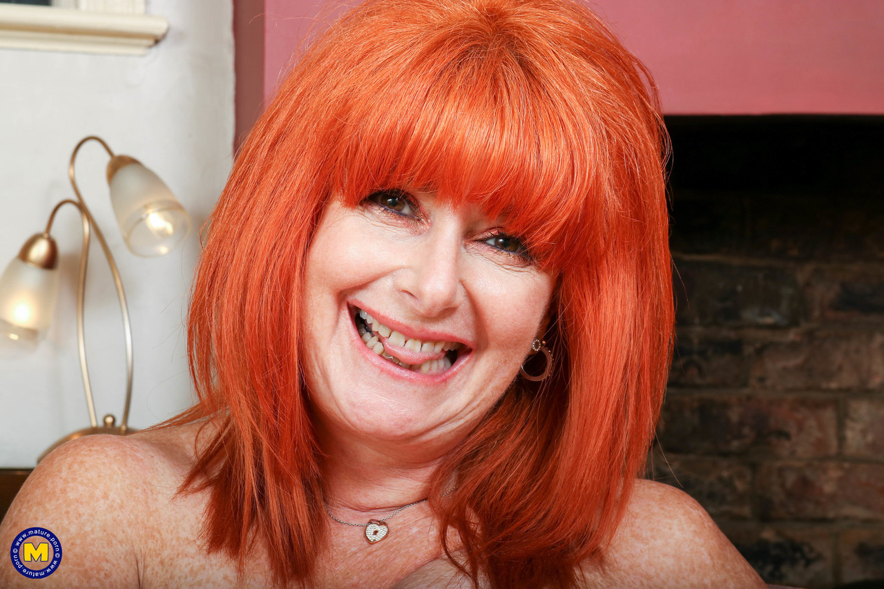 Рыжая постарше расстегивает кожаную юбку, прежде чем показать свои натуральные сиськи и киску