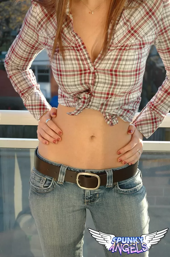 Рыжеволосая деревенская девушка позирует обнаженной в рубашке с завязками и джинсах из денима