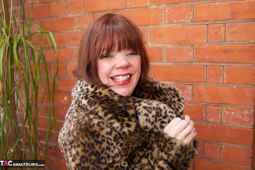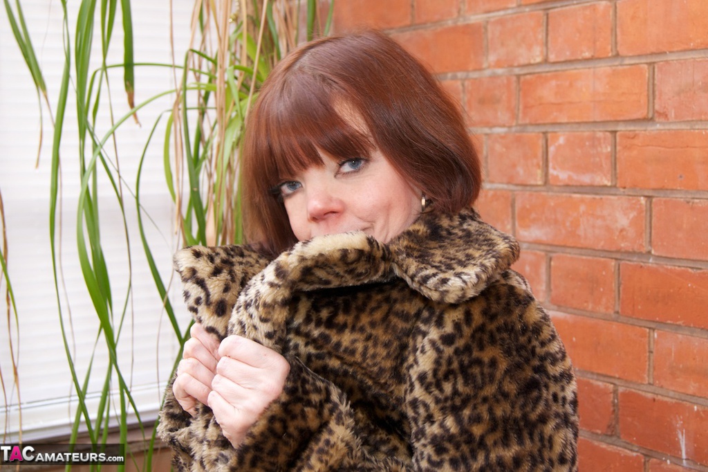 Рыжеволосая девушка постарше мелькает в пальто с леопардовым принтом и черных чулках
