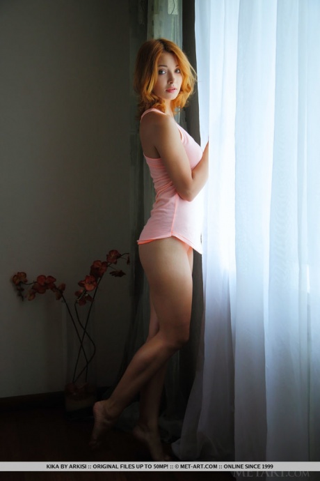 Рыжеволосая гламурная красотка обнажает большие натуральные подростковые сиськи и задницу
