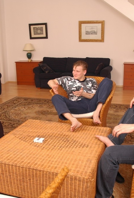 Рыжеволосая постарше сосет один член, в то время как другой трахает ее возбужденную киску