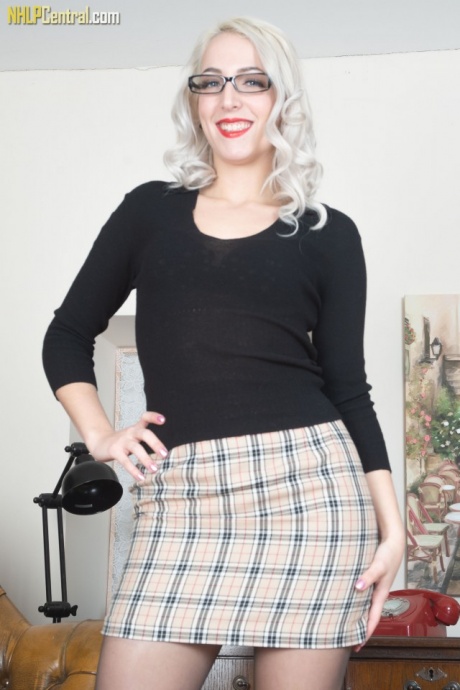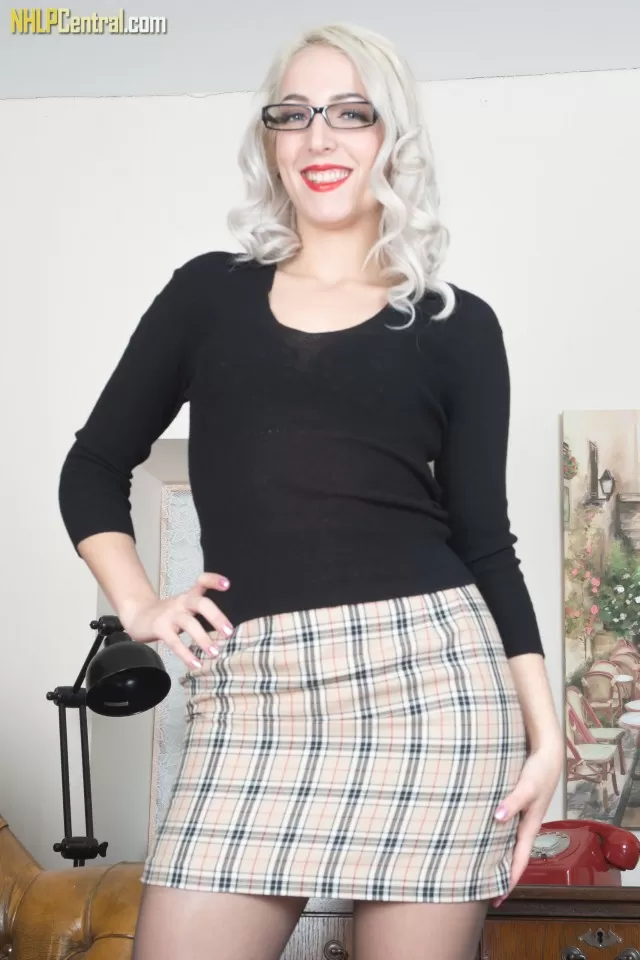 Секретарша платиновой блондинки Лиз Рэйнбоу теребит пальцами свою гладкую киску в разорванном чулке