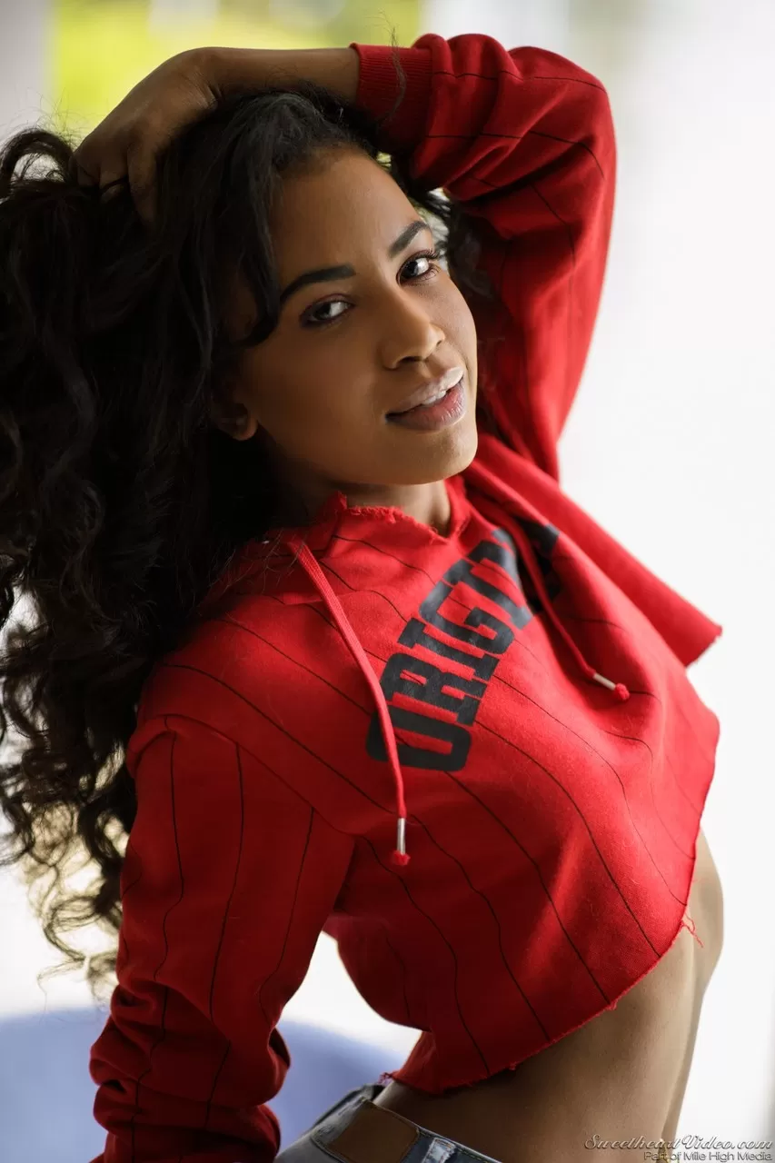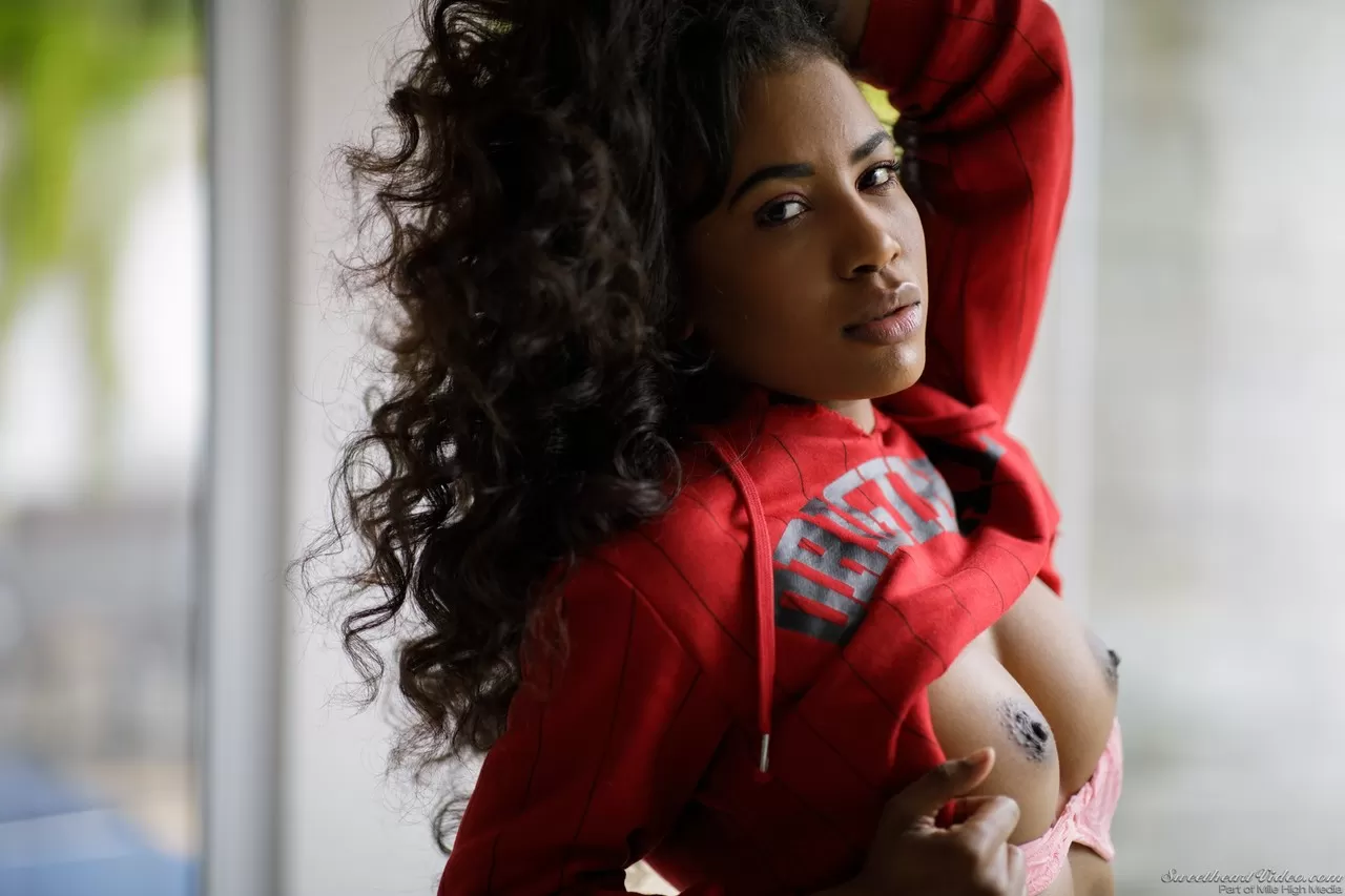 Сексуальная негритянка снимает рваные джинсы по пути к потрясающим позам обнаженной натуры