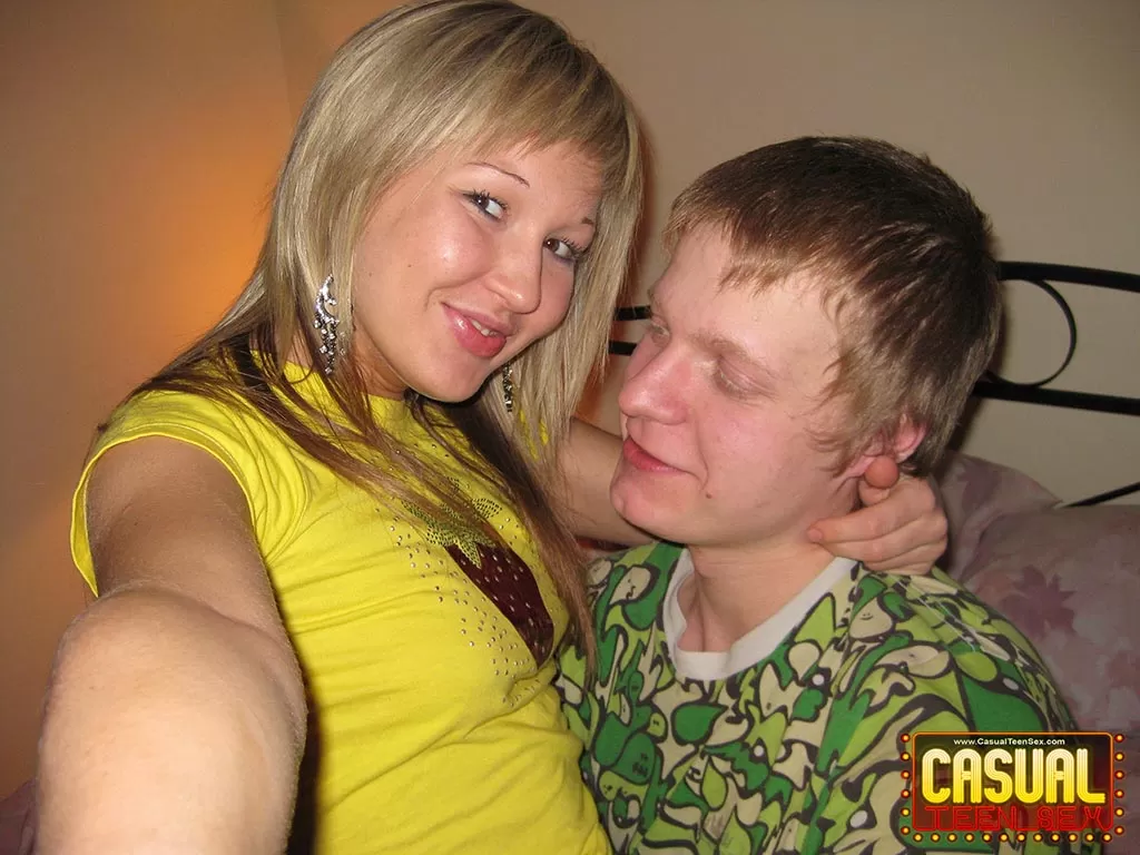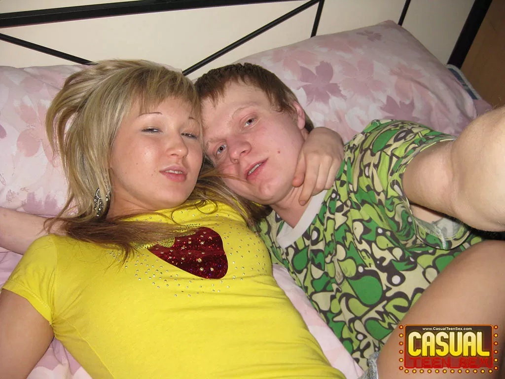 Симпатичная блондинка и ее парень делают селфи, трахаясь на кровати