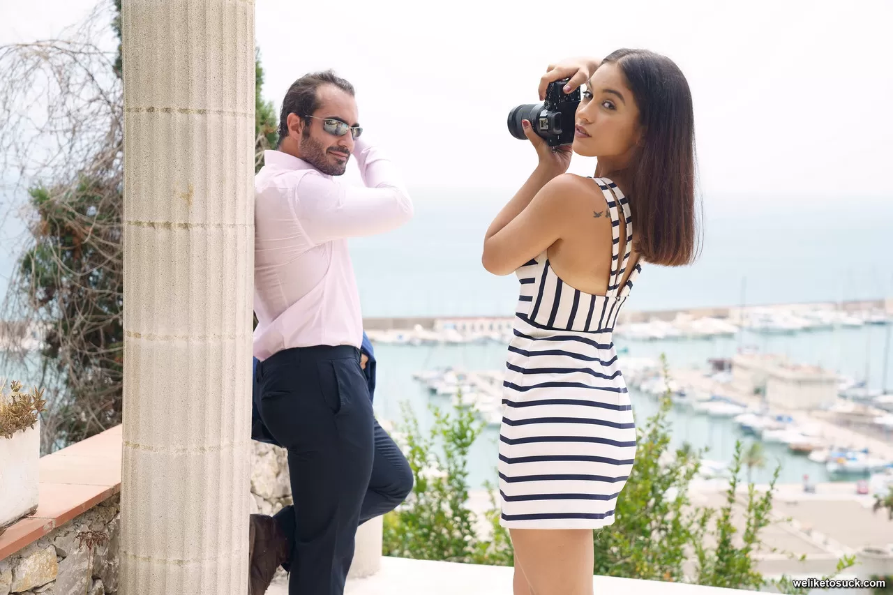 Симпатичная брюнетка Джинебра фотографирует мужчину перед тем, как сделать ему минет