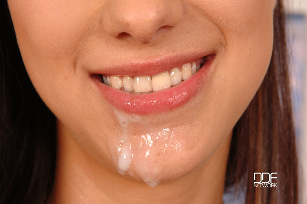 Симпатичная девушка-подросток Виктория Свит брызгает спермой на свой подбородок после того, как дала головку