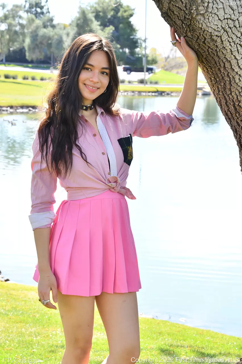 Симпатичная любительница Алексис показывает свою киску на публике во время действия без трусиков и верхней юбки