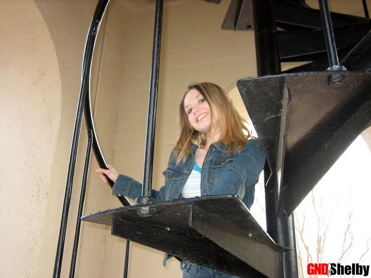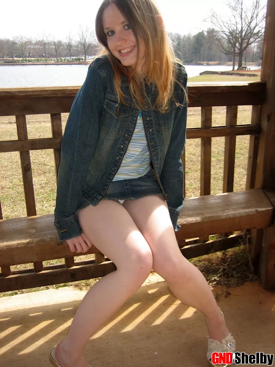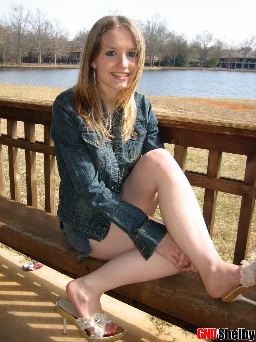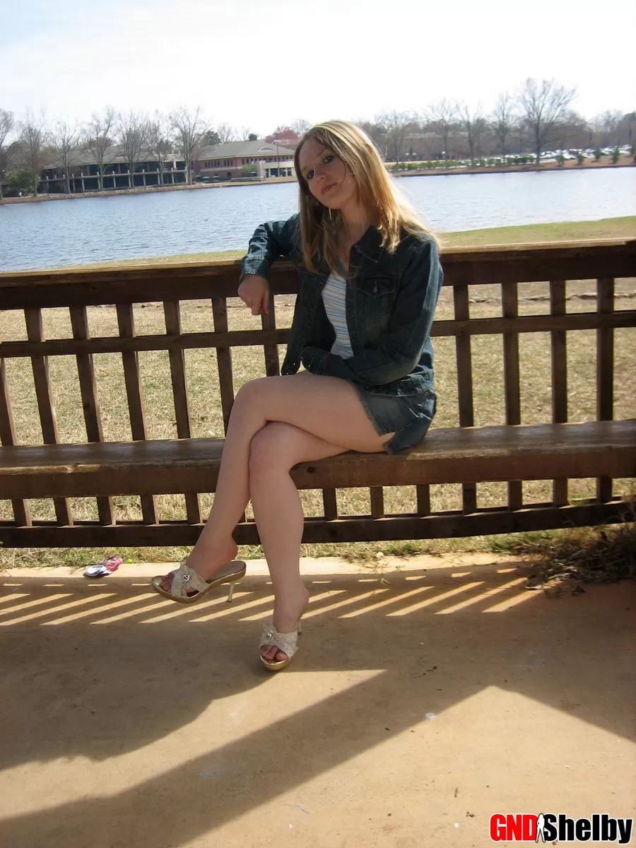 Симпатичная распутная молоденькая Шелби сверкает своими твердыми сосками у озера в общественном парке