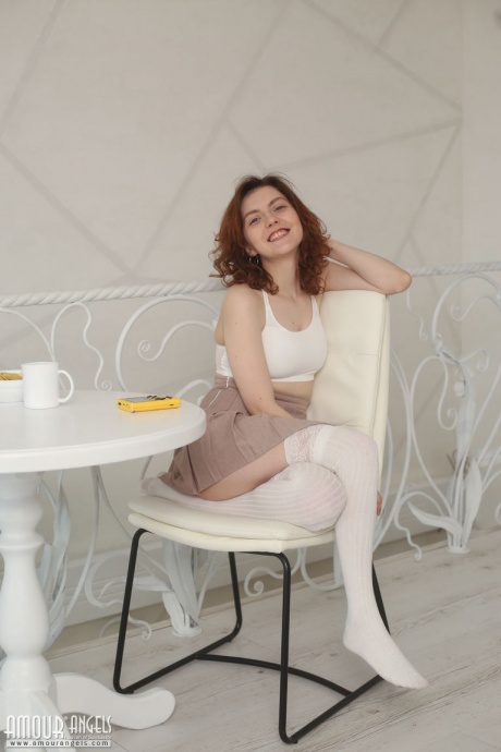 Сладкая молоденькая милашка позирует в чулках и раздевается догола, игриво демонстрируя свои