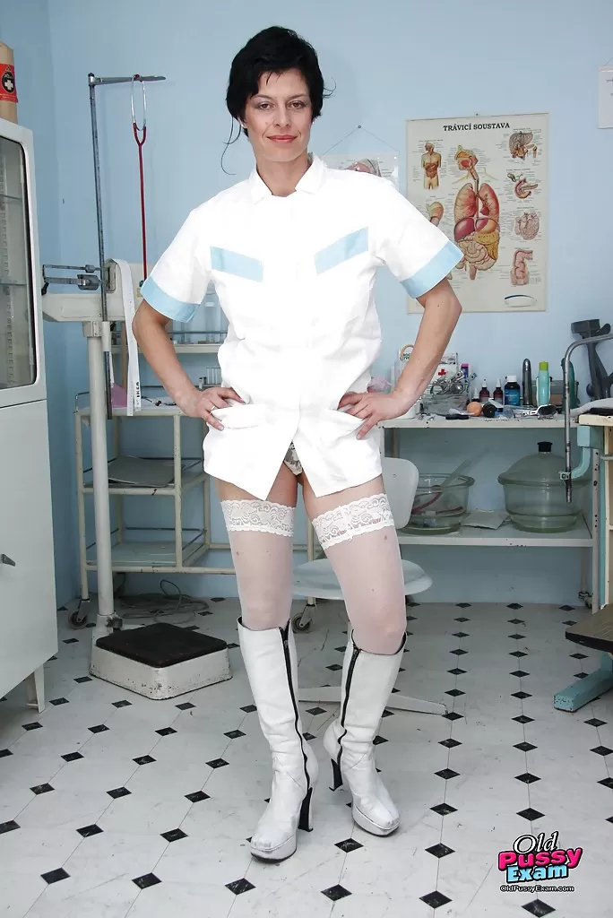 Соблазнительная зрелая медсестра в белых чулочках играет с огромным дилдо