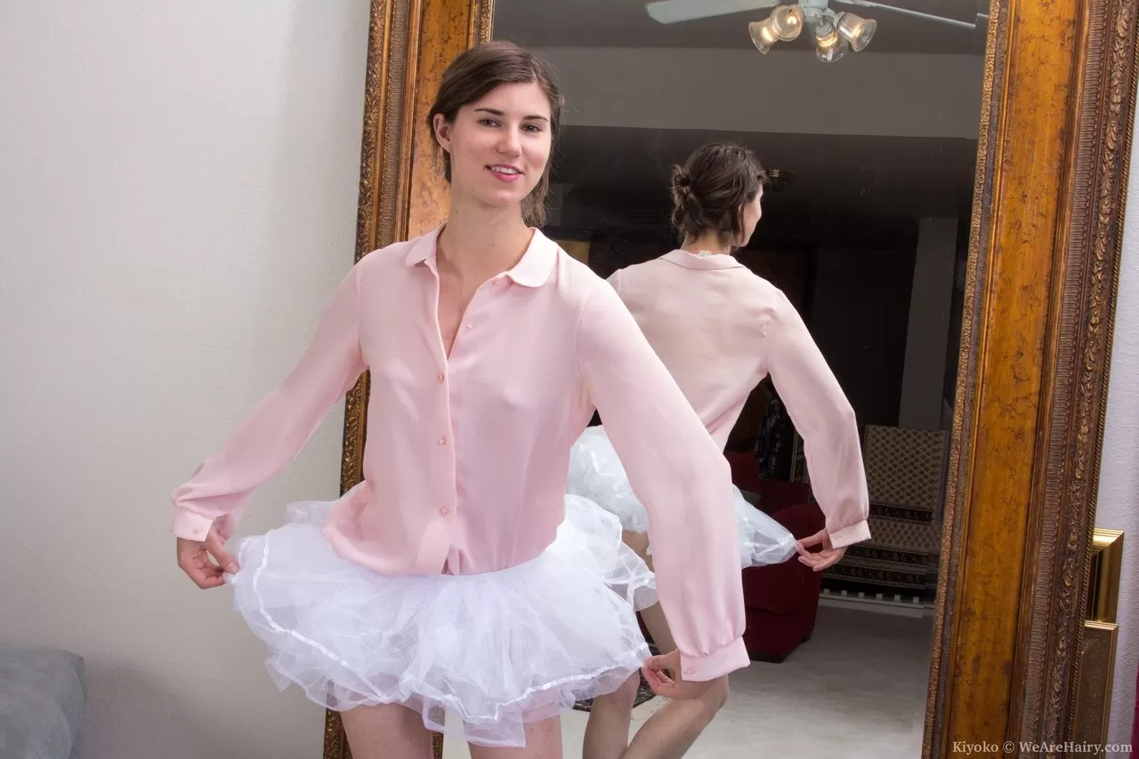 Стройная балерина Киеко с крошечными сиськами демонстрирует свою очень волосатую киску