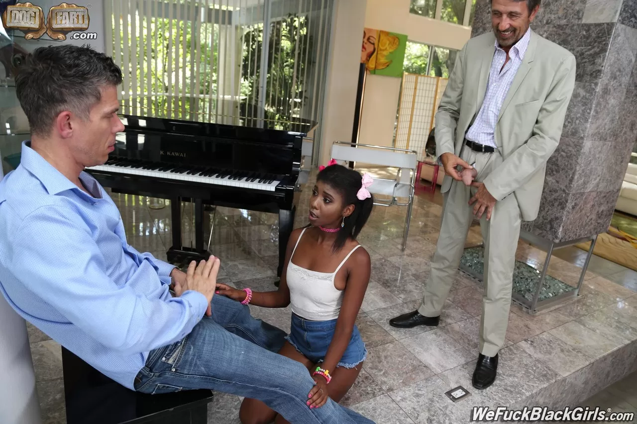 Стройная чернокожая девушка надевает колье, занимаясь сексом сразу с двумя белыми мужчинами