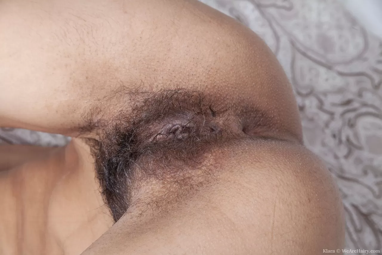 Стройная девушка Клара раздвигает свою волосатую вагину, лежа голой на своей кровати
