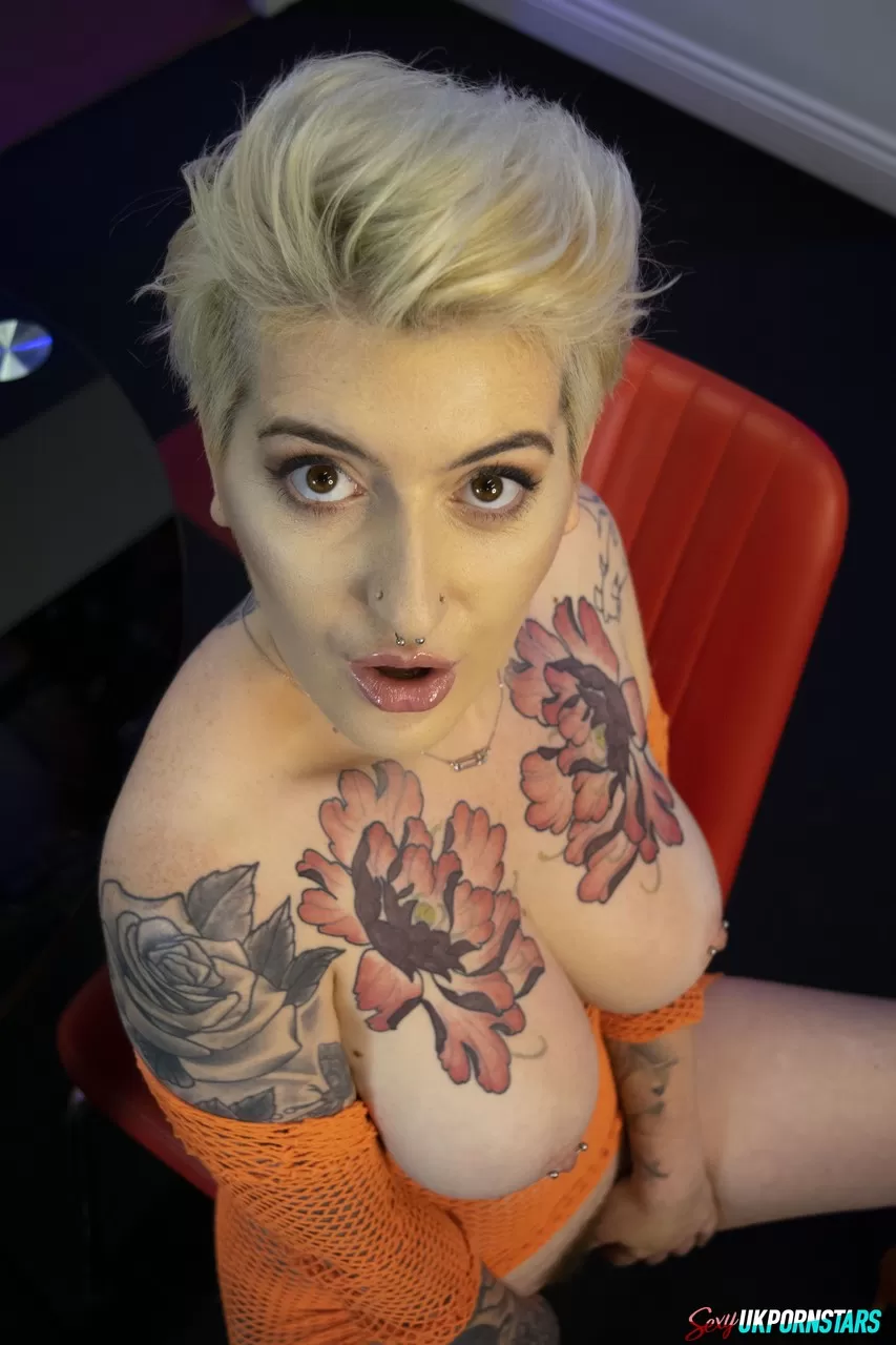 Татуированная девушка щеголяет короткими волосами, демонстрируя свои упругие сиськи и подстриженную муфту