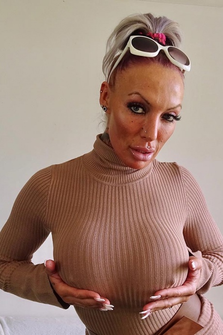 Татуированная женщина Брук Джеймсон раздевается в солнцезащитных очках на голове