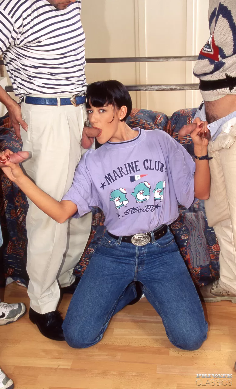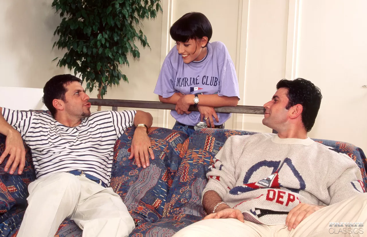 Темноволосая женщина Кэрол Руж делает двойное проникновение во время сцены групповухи