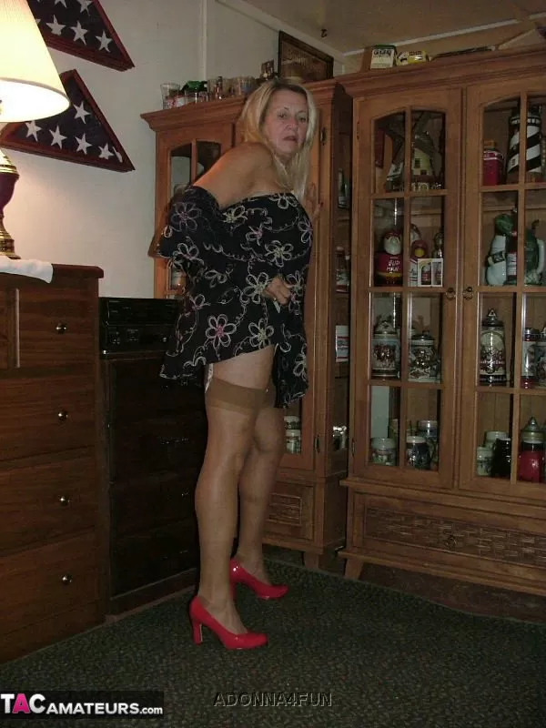 Толстая бабушка со светлыми волосами обнажает себя в коричневых нейлоновых чулках и подвязках