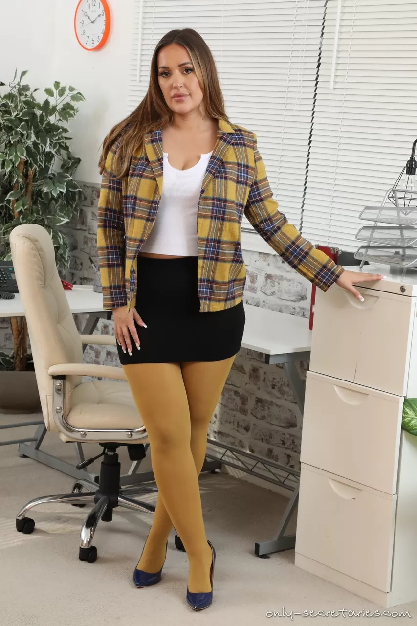 Толстая секретарша Фрэнки Л обнажает свои большие натуральные сиськи в цветных колготках