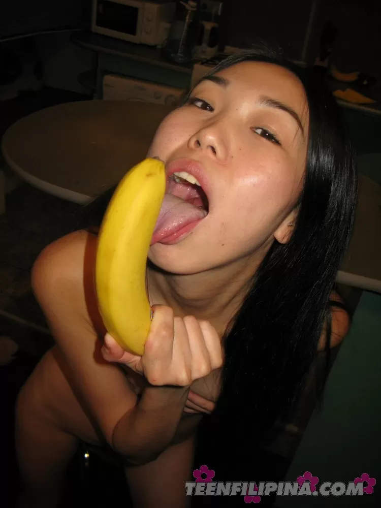 Тощая молоденькая филиппинка Николин Йики дурачится с бананом голышом