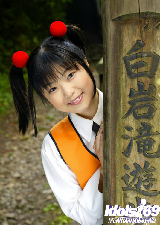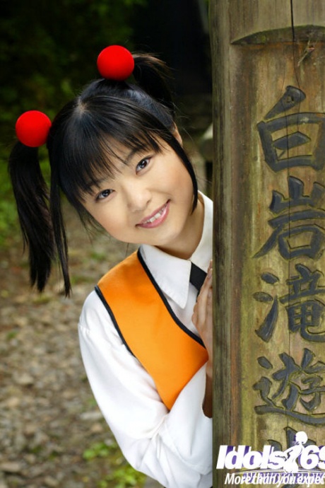 Улыбчивая студентка-азиатка показывает свои крошечные сиськи и пушистую пизду на открытом воздухе