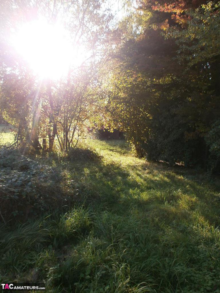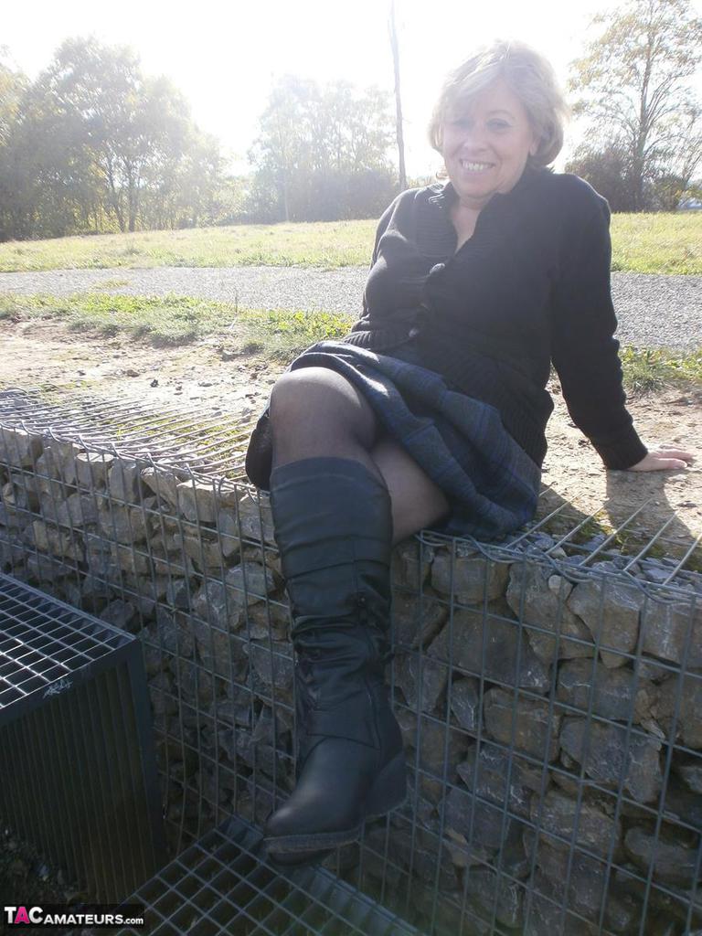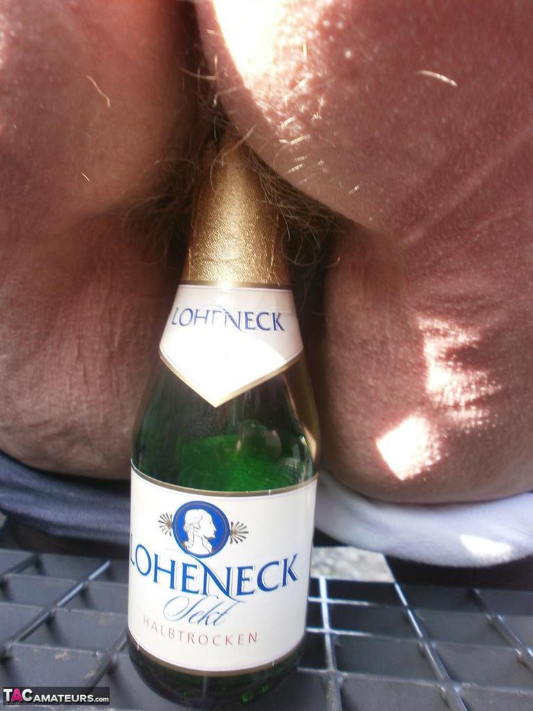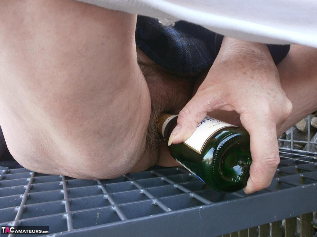 Возбужденная старая Каро на открытом воздухе в сапогах раздвигает киску, чтобы поиграть с бутылкой вина
