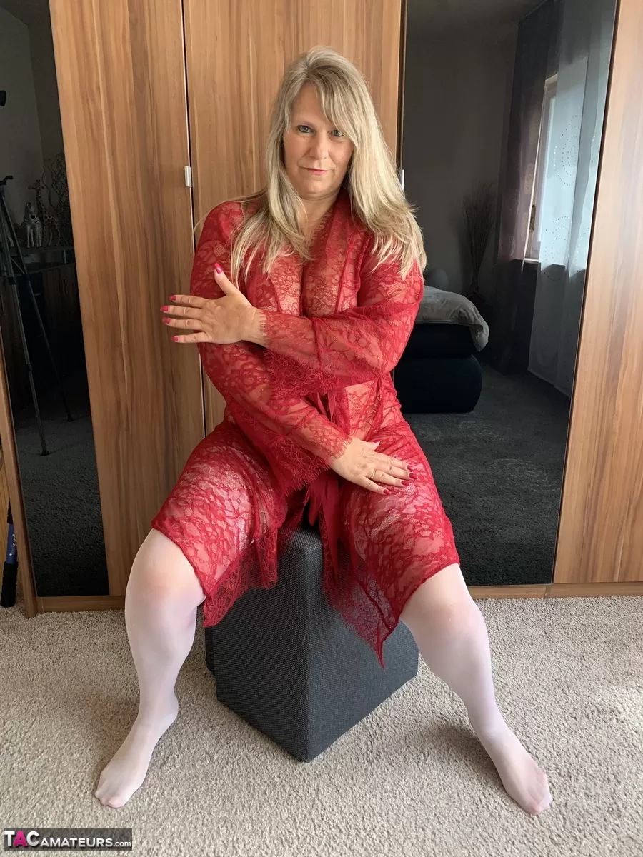 Зрелая блондинка-любительница сладкой Сузи снимает халат, чтобы позировать обнаженной в белых чулках