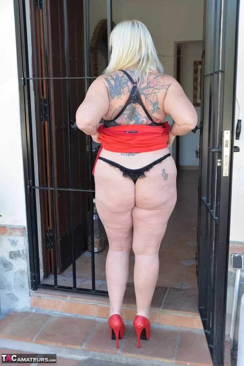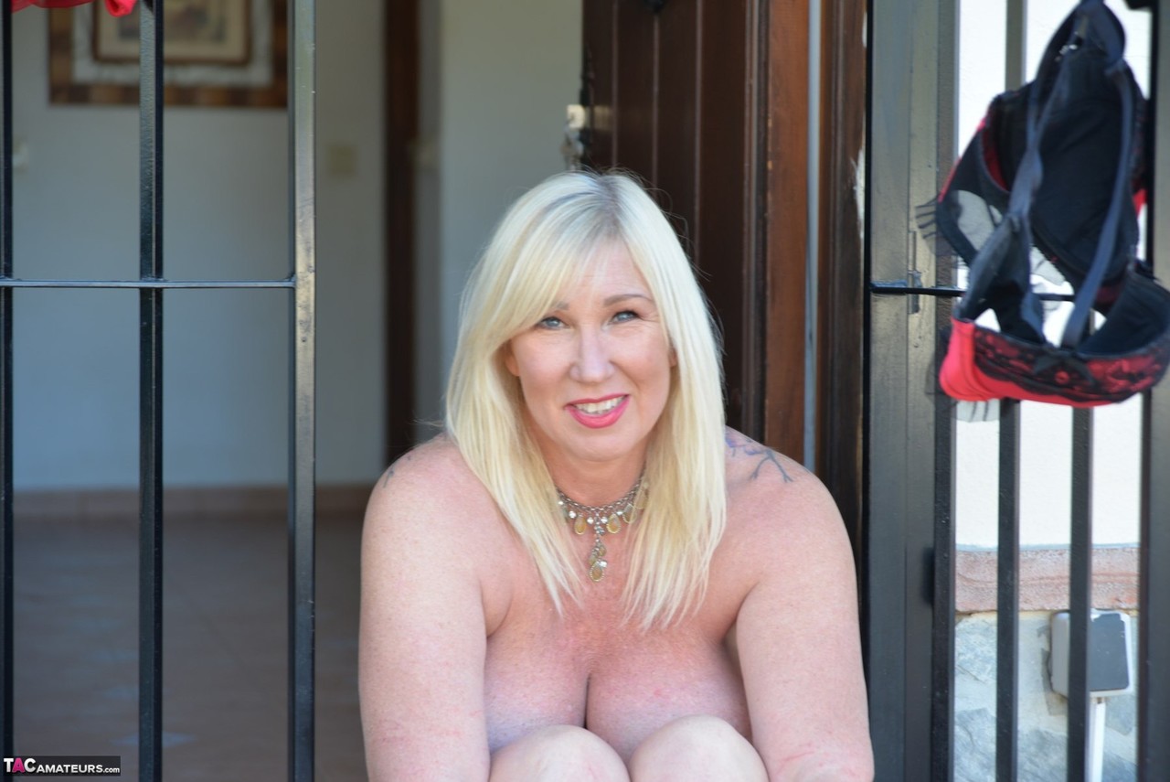 Зрелая блондинка толстушки Мелоди выходит топлесс во внутренний дворик в нижнем белье-стрингах