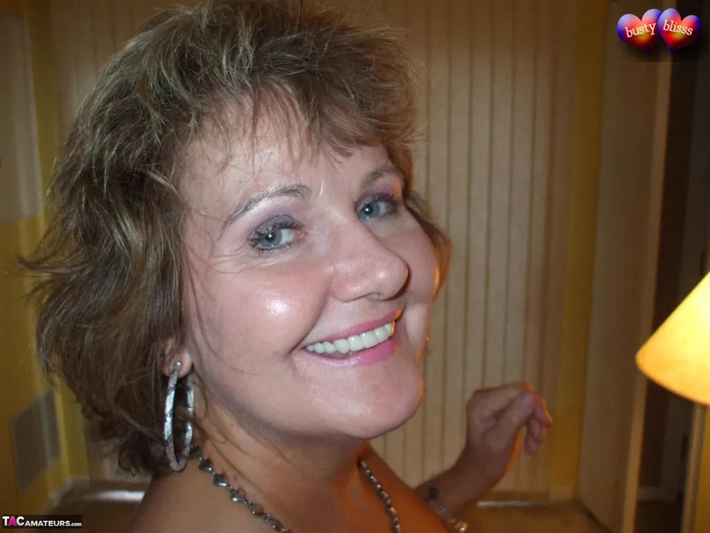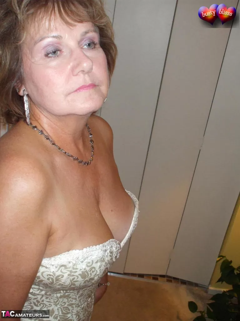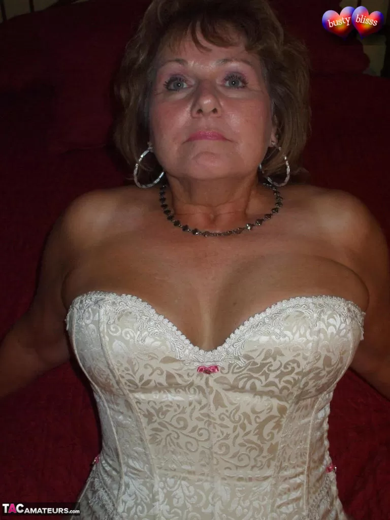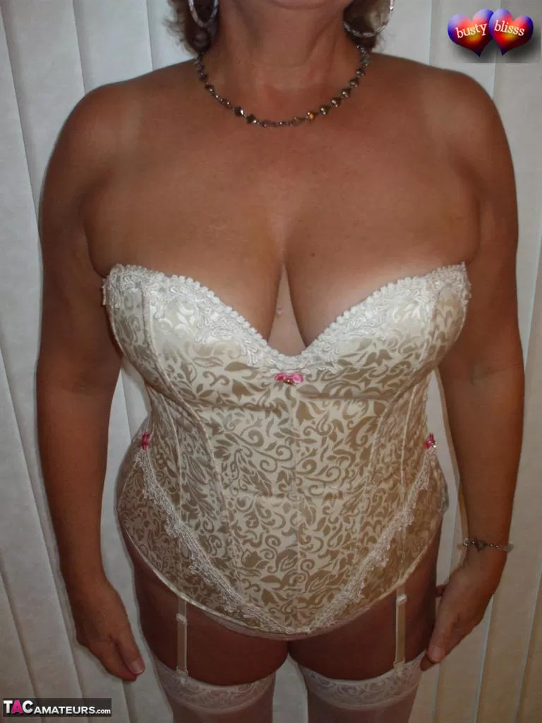 Зрелая женщина позирует обнаженной в корсете и нейлоновых чулках с подвязками
